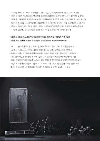 안무를 완성해 나가죠. 최종적으로는 제 생각과 무용수들의 움직임을 함께 섞어서 작품을 완성하게 됩니다.
