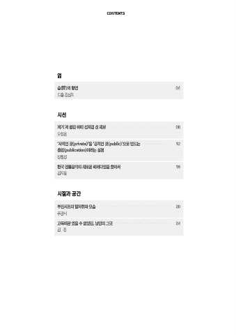 CONTENTS 엶 습(習)의 향연 04 도홍 김상지 시선 저기 저 설원 위에 선처럼 선 채로 08 오성은 ‘사적인 것(private)’을 ‘공적인 것(public)’으로 만드는 12 출판(publication)이라는 실천 장현정 한국 전통음악의 새로운 패러다임을 찾아서 16 김지윤 시절과 공간 부산시조의 발자취와 모습 20 주강식 고독이란 있을 수 없었던, 낭만의 그곳 24 김 정