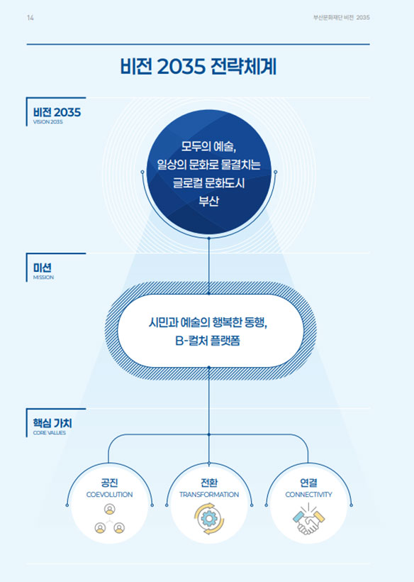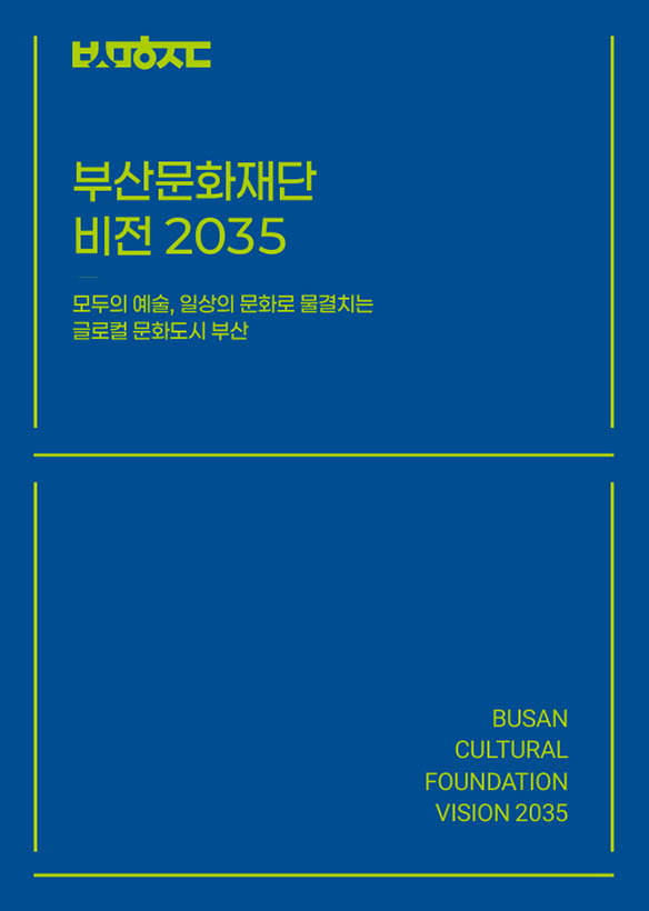 부산문화재단은 <비전 2035: 모두의 예술, 일상의 문화로 물결치는 글로컬 문화도시 부산>을 향해 먼 바다로 닻을 올립니다. 단순히 예산을 집행하고 사업을 관리하는 관성에 머물지 않겠습니다. 우리는 부산의 풍부한 해양 자원을 발굴하여 그 가치를 증폭하고, 부산만의 독특하고 창의적인 부산 문화 ‘B-컬쳐’ 를 제안하고 추진하겠습니다. 더 나아가 재단은 예술가와 시민, 로컬 콘텐츠와 산업, 지역과 세계를 유기적으로 연결하며 확장하는 ‘B-컬처 플랫폼’이 될 것입니다.