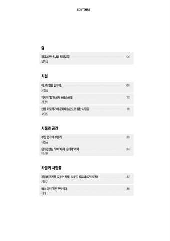CONTENTS 엶 길에서 만난 나의 할머니들 04 임희정 시선 아, 이 힙한 인류여. 08 오성은 역사적 ‘힙’으로서 트랜스로컬 10 김만석 인생 이모작기에 문화예술인으로 힙한 사람들 16 고영삼 시절과 공간 부산 연극의 부흥기 20 이성규 음악감상실 ‘무아’에서 ‘음악에’까지 24 박보은 사람과 사람들 감각의 경계를 지우는 작업, 사운드 설치미술가 정만영 32 김혜민 예술 아닌 것은 무엇인가 38 이하니