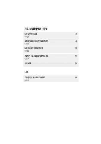 지금_부산문화재단 15주년 나의 음악적 토요일 43 이가온 동화작가에 이어 동시작가 타이틀까지 46 박미라 나의 예술창작 원천을 찾아서 50 하경희 부산에서 지원사업을 담당한다는 것은 52 안신영 함께, 여름 56 너머 고요한 일상, 고요하지 않은 하루 58 이슬기