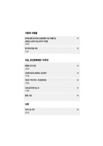 사람과 사람들 완벽을 향한 움직임과 불완전함에 깃든 아름다움 32 경희댄스시어터 대표·안무가 박재현 오범택 한국어와 한글 서예 38 조은하 지금_부산문화재단 15주년 베를린 감각 단상 43 양나영 건강한 예술이 탄생하는 공간에서 46 박정윤 여전히 ‘우리 회사’, 부산문화재단 50 하영문 나를 움직이게 하는 것 54 박재현 함께, 가을 56 너머 더위 다음 추위 58 김지훈