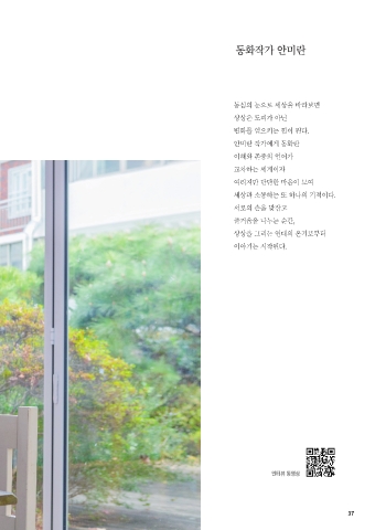 동화작가 안미란 동심의 눈으로 세상을 바라보면 상상은 도피가 아닌 변화를 일으키는 힘이 된다. 안미란 작가에게 동화란 이해와 존중의 언어가 교차하는 세계이자 여리지만 단단한 마음이 모여 세상과 소통하는 또 하나의 기적이다. 서로의 손을 맞잡고 즐거움을 나누는 순간, 상상을 그리는 연대의 온기로부터 이야기는 시작된다. 인터뷰 동영상 37