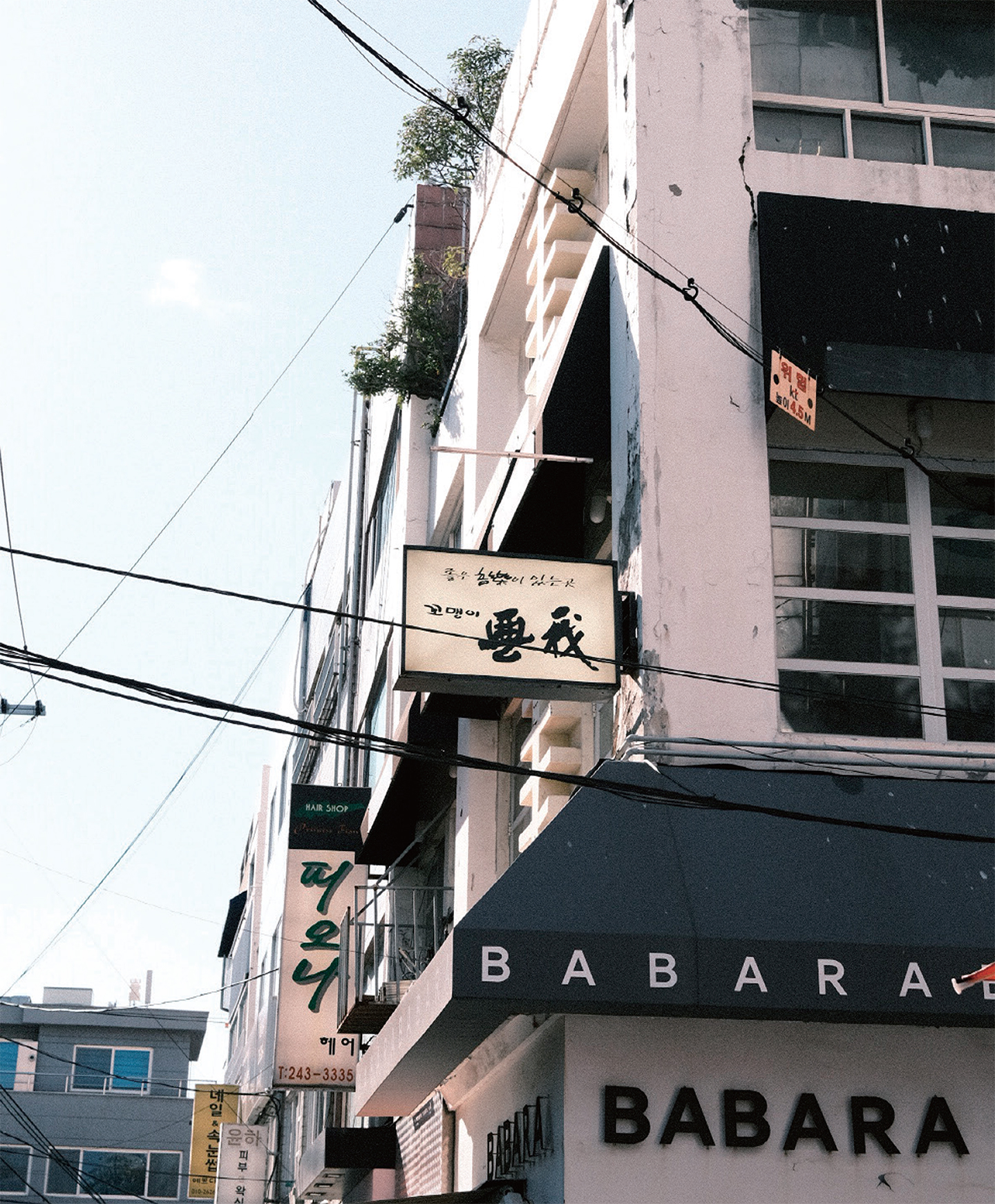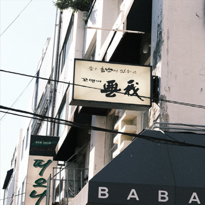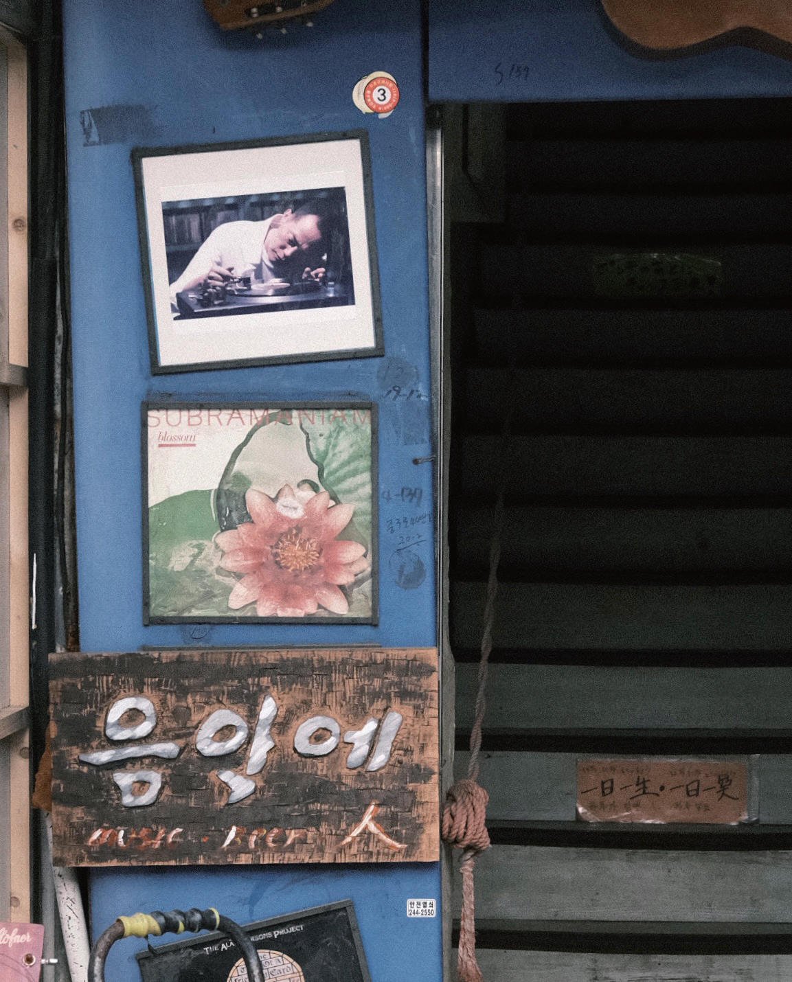 나는 ‘무아’의 흔적을 쫓기로 했다. ‘무아’ 이후 남포동에는 ‘꼬맹이 무아’와 ‘음악에’가 생겼다는 기록을 기사03에서 찾을 수 있었다. 남포동 뒤편 국제시장에서 시작된 가게 찾기의 여정은 ‘꼬맹이 무아’에서부터 시작했다. 다행히 ‘꼬맹이 무아’는 지도에서 검색이 된 덕에 디지털 힘을 빌려 쉽게 찾았지만, 문을 닫은 이후였다. 사거리 골목 모퉁이에 위치한 가게는 2층에 자리 잡고 있었고, 건물 외벽 간판도 그대로였다. 올라가는 계단의 ‘Chet Baker’ 벽화와 입구 유리문에 붙어있는 ‘좋은 音樂이 있는 곳’, ‘꼬맹이 무아’ 시트지와 김현석의 앨범 재킷 포스터도 볼 수 있었지만, 유리창 넘어 공간은 공허하게 텅 비어있었다. ‘꼬맹이 무아’의 껍데기만 남은 공간은 ‘음악에’를 더욱 찾고 싶게 만들었다. ‘음악에’는 지도에 주소가 뜨지 않아, 인터넷에 떠도는 수많은 정보에서 위치를 찾았다. 위치는 ‘오겡끼카레’ 위층으로 구제 골목 중간에서 발견할 수 있었다. 다행히 문을 닫은 것으로 보이진 않았고, 누군가 찍어 올린 가게 사진에서 찾은 연락처를 통해 사장님과 연락이 닿게 되었다. 지금도 가게를 운영하고 계신다는 연락을 받고, 어둑한 밤 ‘음악에’를 다시 방문했다. 거리엔 ‘음악에’를 안내하는 큰 표지판은 없지만, 저녁 하늘의 별처럼 빛나는 파란 간판이 눈에 띈다. 간판을 따라 도착한 건물이지만 ‘음악에’에 가기 위해선 굉장히 가파른 계단을 3층까지 올라야 했다. 굵은 밧줄을 잡고 올라간 후, 입구 문을 열면 눈앞에 작은 DJ 공간이 등장한다.