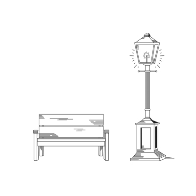 광장 속 벤치 하나, 가로등 하나, 계절을 알 수 없는 나무들