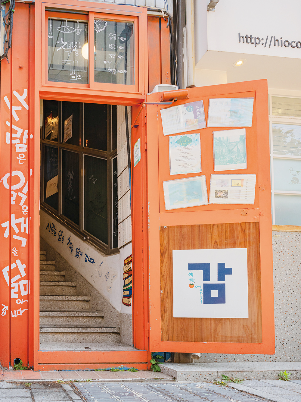 교대역 3번 출구에서 부산교육대학교 방면으로 300미터쯤 떨어진 거리. 부산교육대학교 정문 바로 옆 골목에서 ‘책방 감’을 찾을 수 있었다. 먼저 2층에 위치한 이 책방으로 향하는 좁은 계단의 계단 벽면이 눈길을 끈다. 마치 서가에 빽빽하게 꽂혀 있는 책을 연상시키는 타일 하나하나에 남겨진 사람들의 흔적. 이곳이 많은 사람에게 사랑받는 공간임을 짐작할 수 있었다.