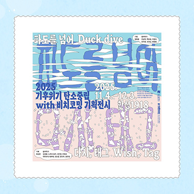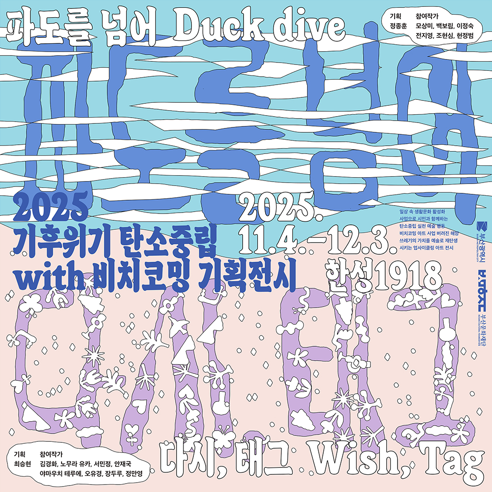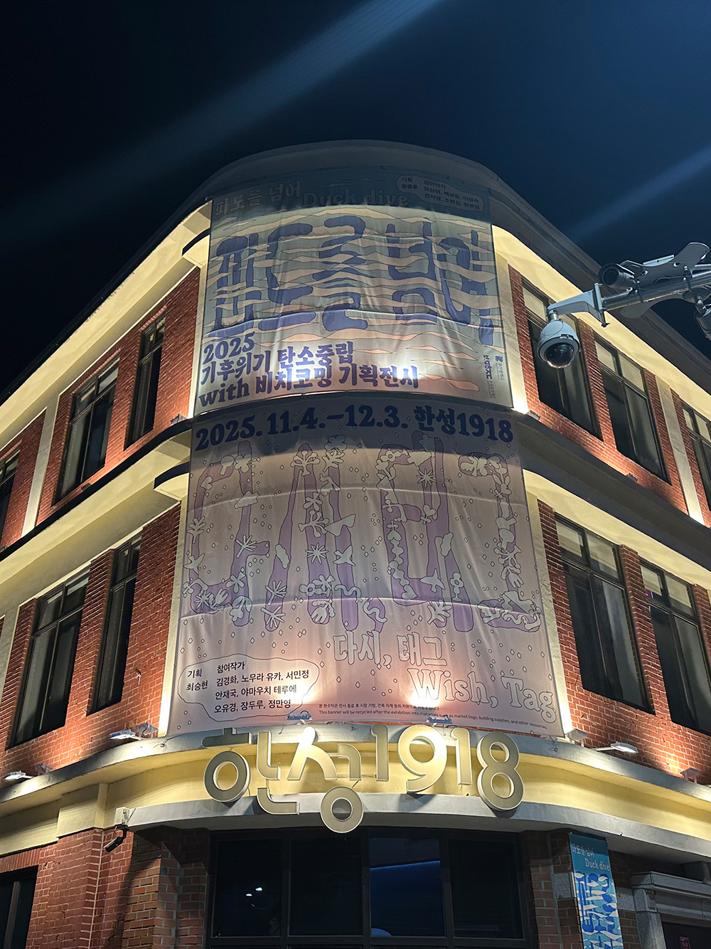 기획전시 《2025 기후위기 탄소중립 with 비치코밍》는 그런 자연과의 일체 감각을 누구보다 앞서 회복한 이들에 의해 시작되었다. 부산문화재단과 시민단체가 주축이 되어, 지난 5년 동안 시민들의 참여를 기반으로 진행해 온 비치코밍 활동을 전시의 형태로 정리해 보자는 데서 출발했던 것이다. 말보다는 행동과 실천으로 회복의 길을 닦아온 이들의 이야기다. 사진, 영상 등의 기록은 물론, 비치코밍으로 얻은 오브제를 활용한 설치 작업에 이르기까지 다양하게 축적된 결과물들은 그들이 그간 얼마나 값진 시간을 쌓아 왔는지 여실히 보여주는 숨 쉬는 자료이기도 했다. 하지만 지난 성과에 더해, 전시장으로 사용 예정이었던 한성1918의 재개관이라는 역사적 전환점에도 의미를 실어, 보다 의미 있는 사업을 추진해 보려는 부산문화재단의 열의가 구체화되면서 전시는 점차 확장되었다. 그리고 바로 그 무렵, 나도 이 전시의 기획자로 참여하게 되었고, 기획전시 《2025 기후위기 탄소중립 with 비치코밍》은 비치코밍의 실제 기록을 다루는 《파도를 넘어》, 기후위기에 대한 우리의 인식과 사유를 다루는 《다시, 태그》 두 개의 전시로 구성되는 최종의 골격을 갖추게 되었다.